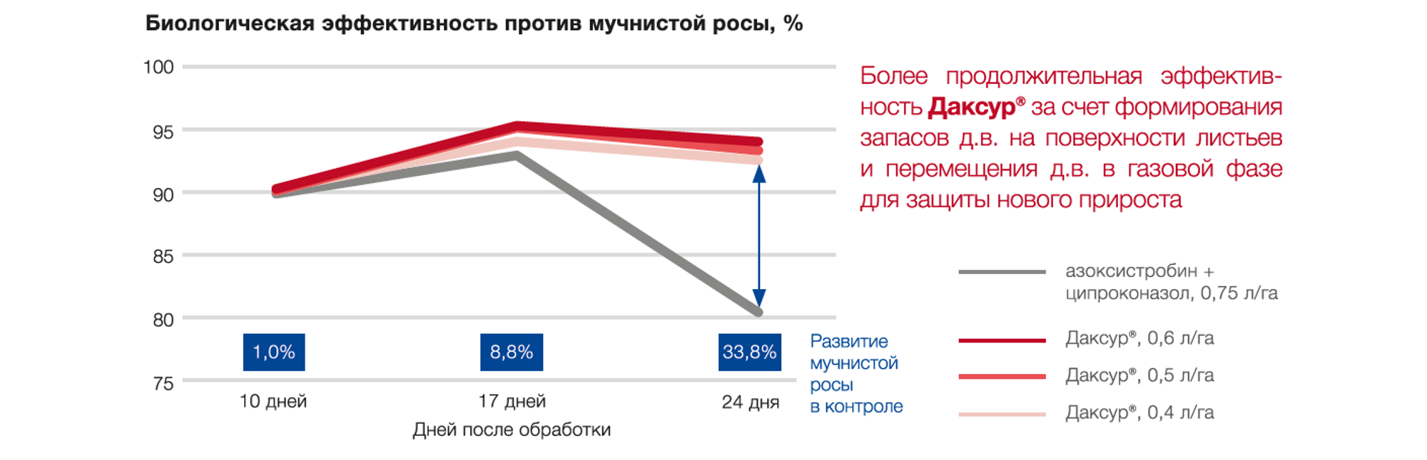 Лучшая биодоступность фунгицида в формуляции Даксур®: постепенное и длительное перемещение действующих веществ в тканях для долговременной защиты без стресса для культуры.